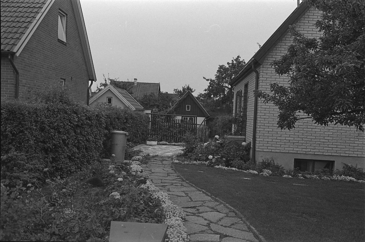 Utomhusbild av ett 1,5-planshus med rabatter, stenlagd trädgårdsgång och gräsmatta. Ärtholmsvägen 176.