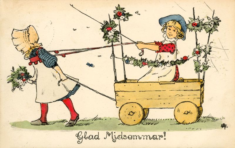 Bild: Illustrerad bild med två barn som drar i blomster dekorerad släpvagn.
