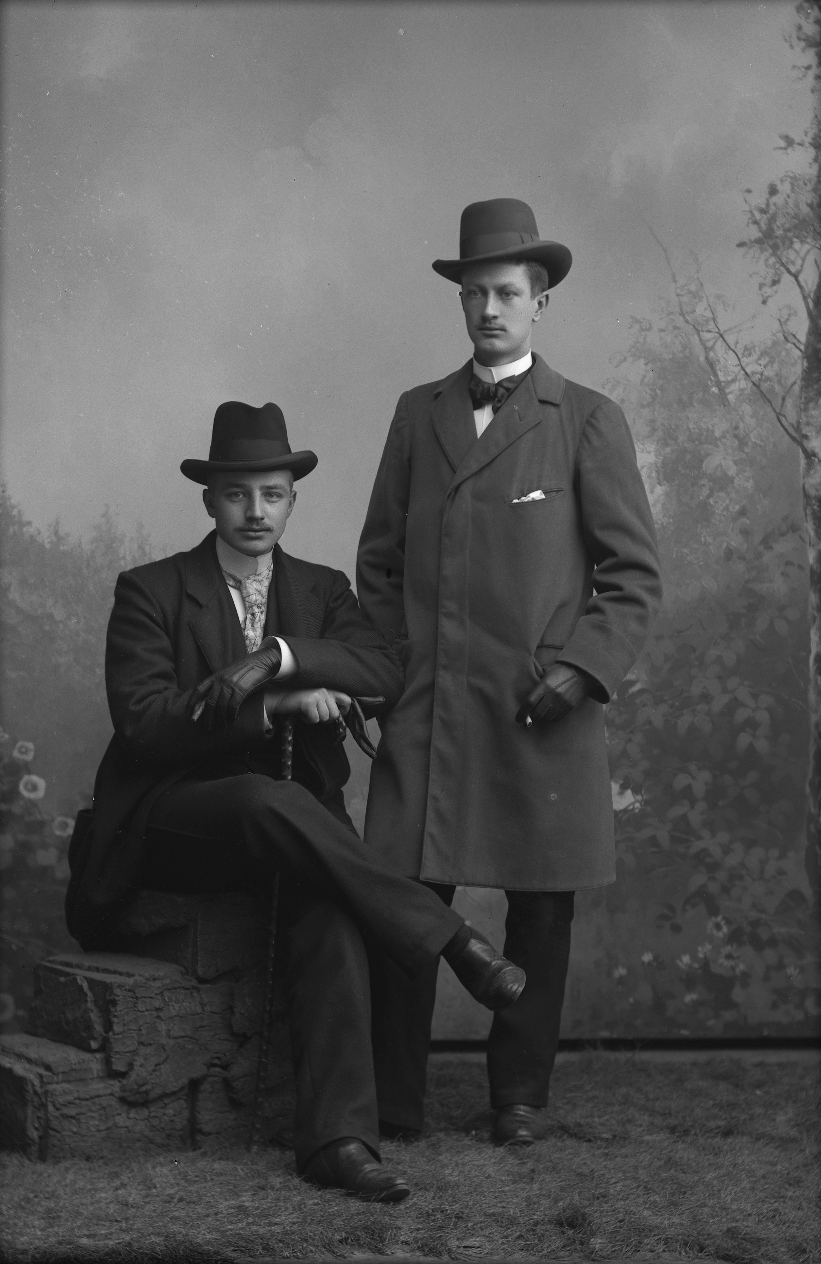 - Porträtt i helfigur av amanuens Harald Fröderström med okänd man, båda iklädda hattar, handskar och ytterrockar. En av männen sittande på liten stentrappa, hållande käpp, den andre hållande cigarr. Fotograferade framför ateljéfond med skogs- och blomstermotiv.