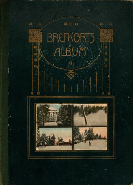 Albumet är av grön perforerad kartong. På framsidan en färgbild med vinterlandskaps motiv och en byggnad. Bilden är omgiven av tryckt ram i guldfärg. Text mitt på framsidan i guld: Brefkortsalbum.