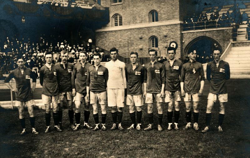 Olympiska spelens i Stockholm 1912 officiella brevkort. Bild: Sveriges fotbollslag.The Swedish football team 1912 in Stockholm.
