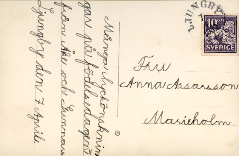 Brevkort skrivet av Åke och gunnar till Fru Anna Assarsson, Marieholm.