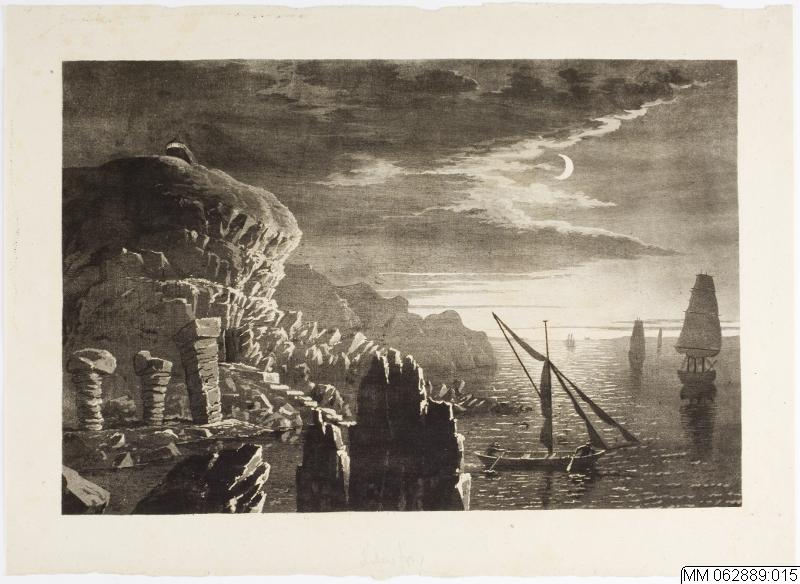 Litigrafiskt tryck med motiv från Öresund och Kullens fyr, från norr, tecknad av Ulrik Thersner.