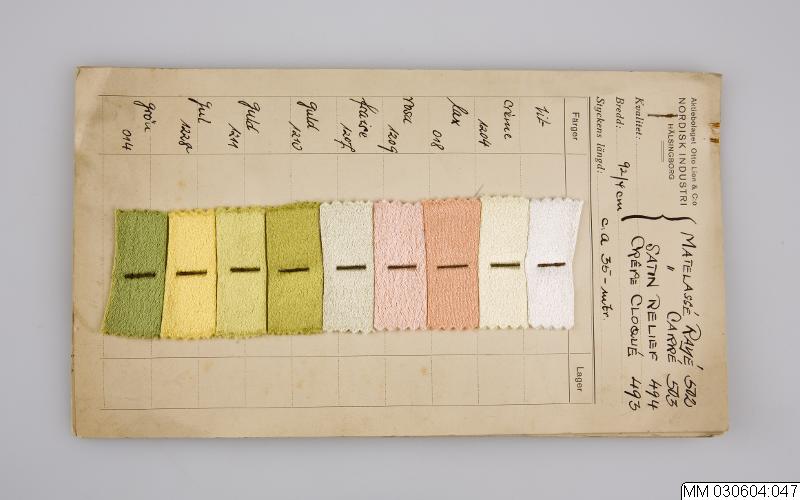 Häfte med fyra papperskartor med tygprover.