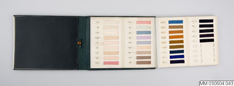 Fyra kartor med tygprover samlade i en mapp med styva pärmar samt en ficka med tryckknapp för större tygprover