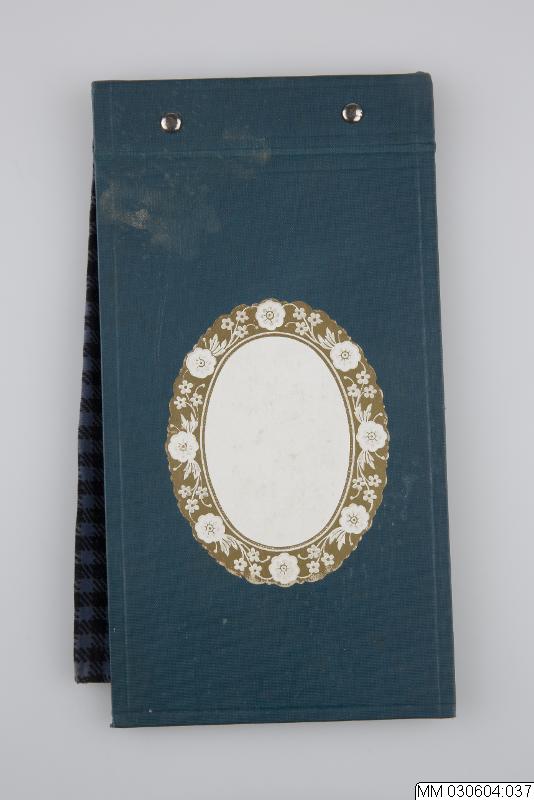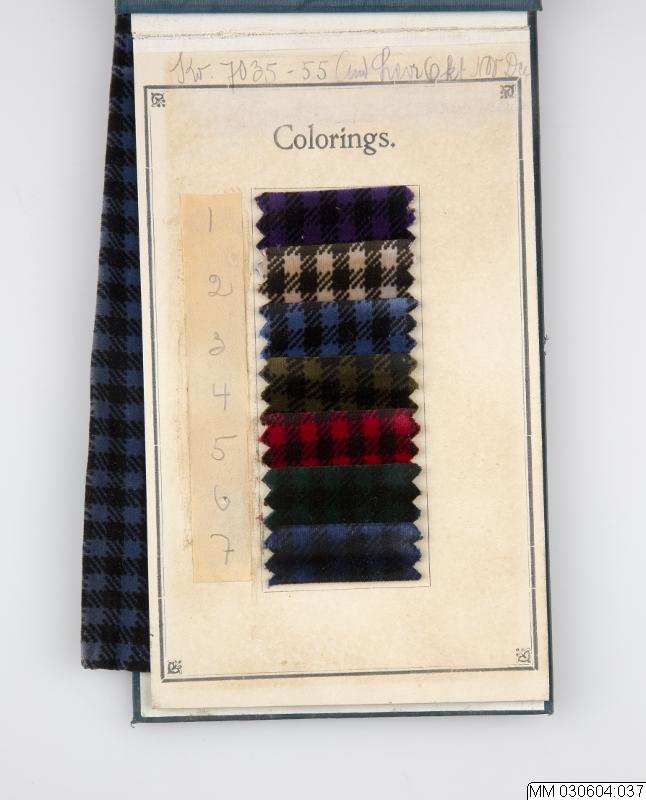 En tygprovskarta och ett större tygprov på rutig sammet i en liten pärm.