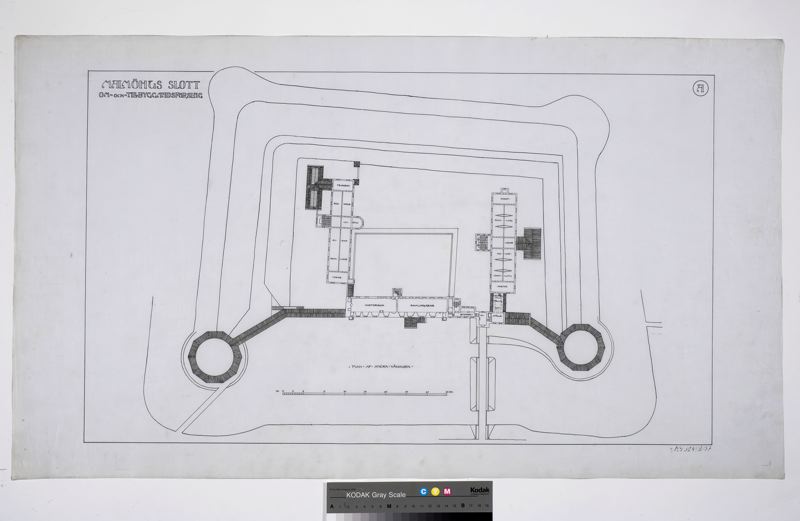 - Malmöhus slott, om- och tillbyggnadsförslag A. Plan av andra våningen av slottet inrett för historiska samlingar och östra och västra fängelselängorna inredda för museisamlingar.
