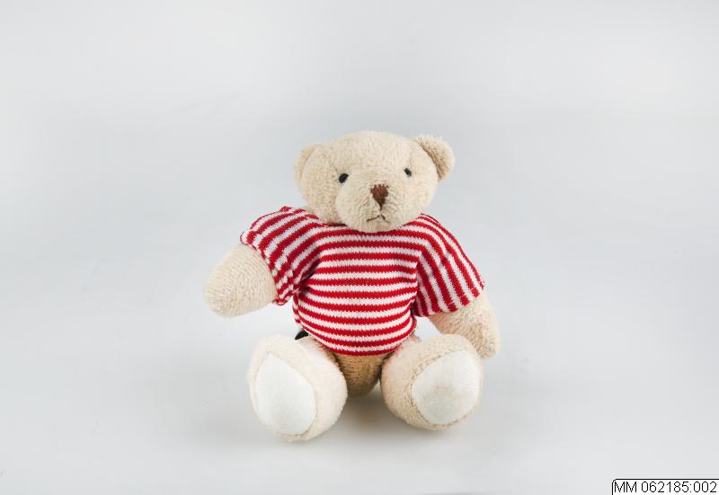 Leksaksbjörn beige, klädd i röd- och vitrandig tröja.