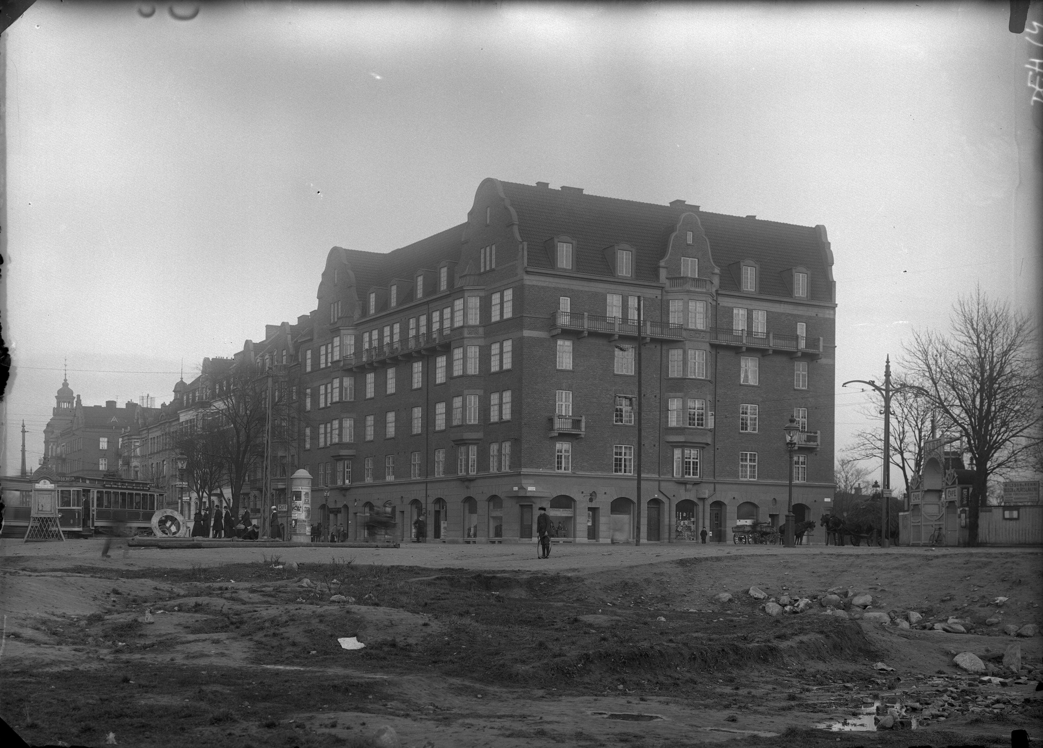 - Torgbild - Värnhemstorget. Uppgrävd mark med byggnad och spårvagn i bakgrunden. Ingång till ett kafé på höger sida. En pojke med ett rullband.