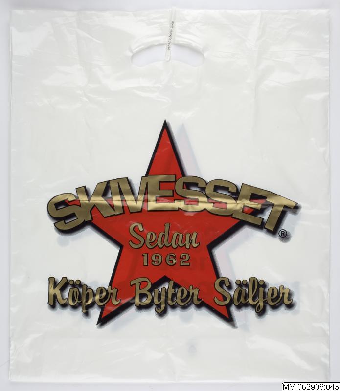 Varukasse från Skivesset, vit bakgrund med en stjärna i rött och svart och text i guld som lyder: Skivesset sedan 1962 köper byter säljer.