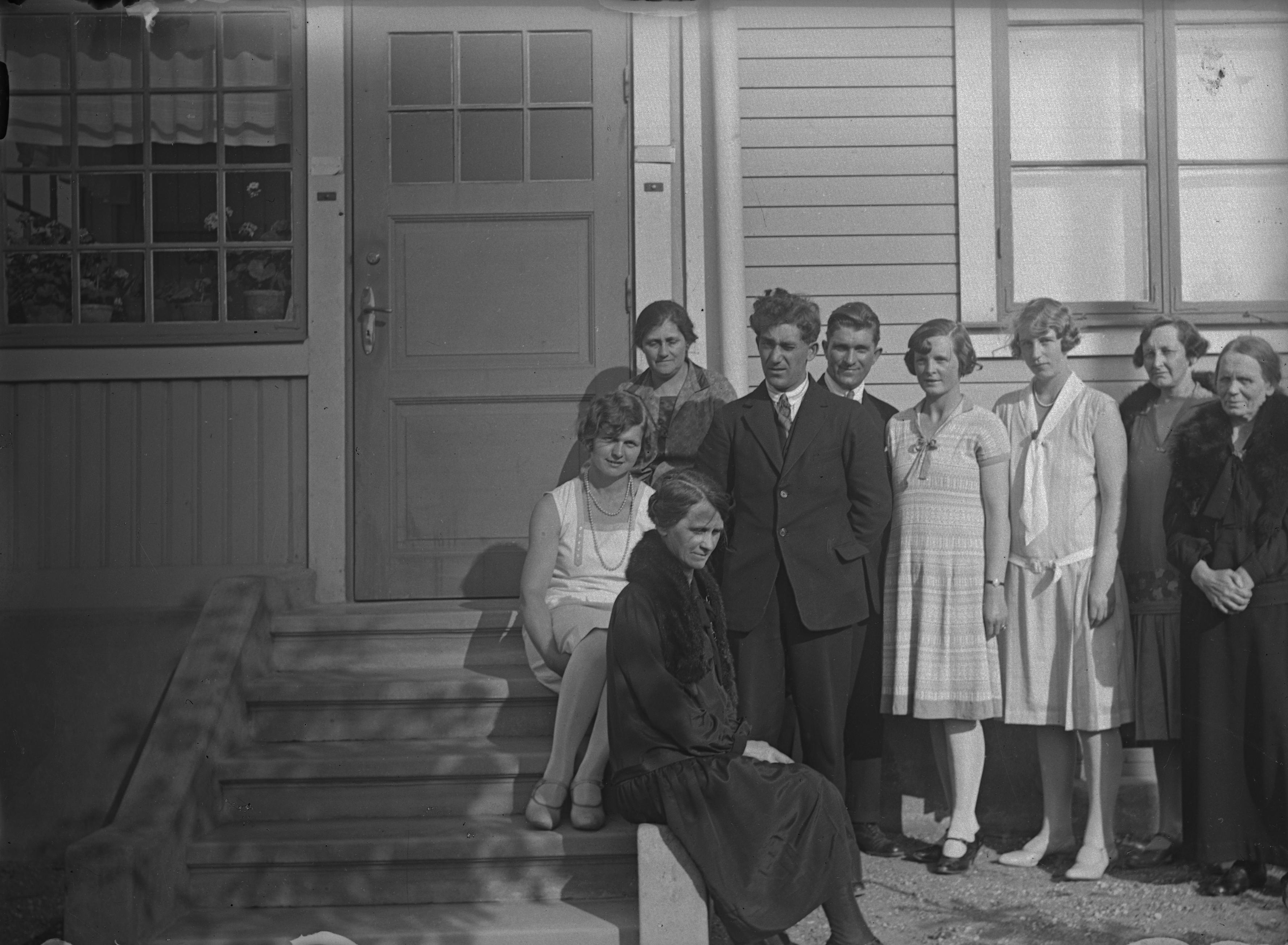 Grupp vid hustrappan, exteriör.