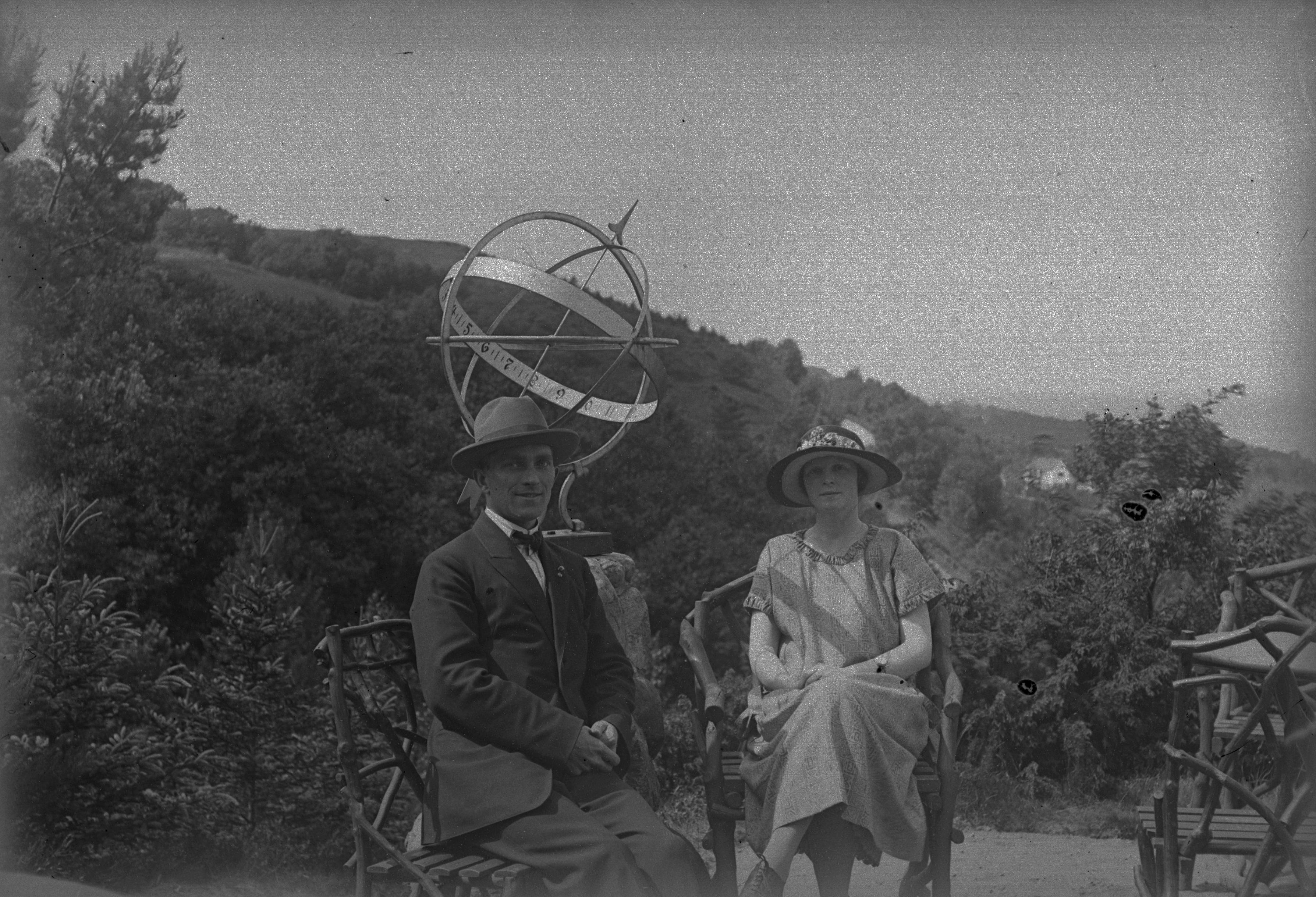 Par i trädgården, solur i bakgrunden. (fotograf)