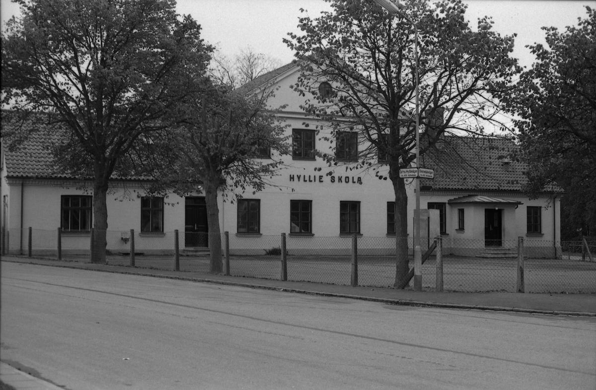 Utomhusbild som visar Hyllie skola. Skolhus med skolgård och staket vid en väg.