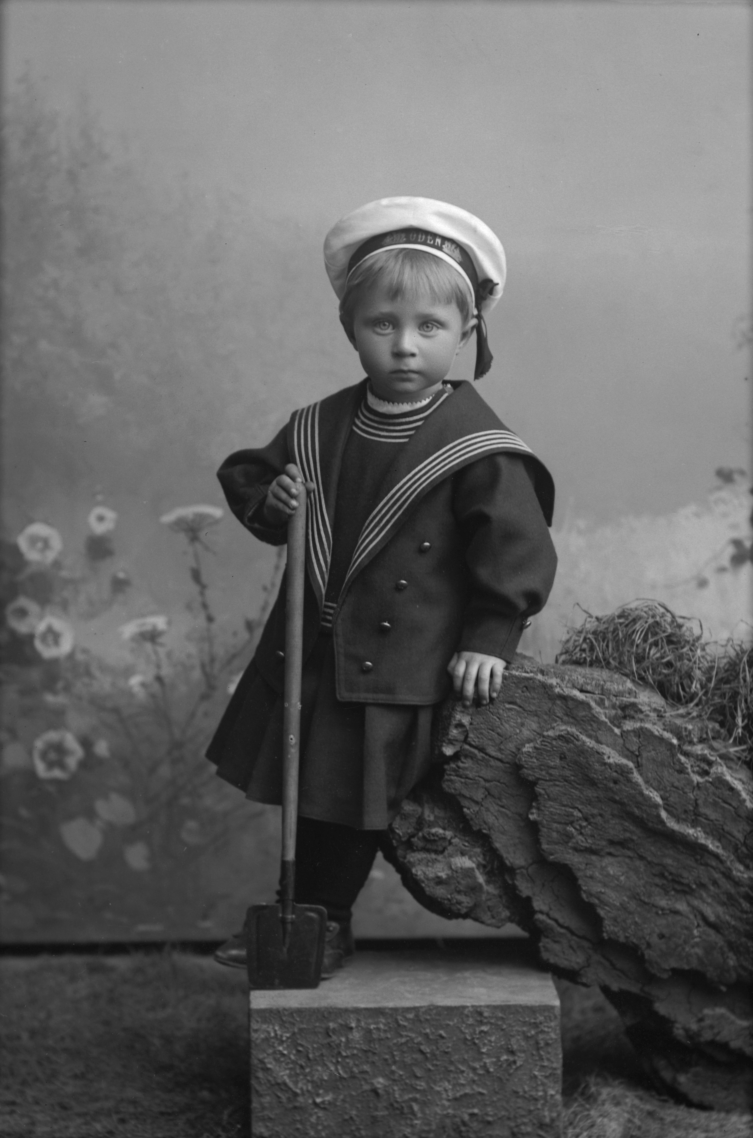 Porträtt i helfigur av Lindblads barn i sjömanskostym och -mössa, stående invid stenhäll, hållande långskaftad hacka. En ateljéfond med skogs- och blomstermotiv utgör bakgrunden.