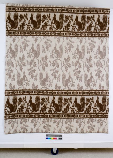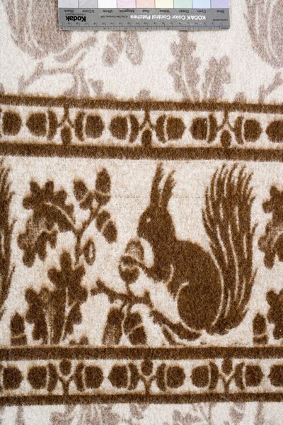 Yllefilt med beige botten och breda tvärgående mönsterbårder i mörk-och ljusbrunt. Motiv av ekorrar, ekkvistar och ekollon. Kortsidorna är fållade med grov langettsöm.