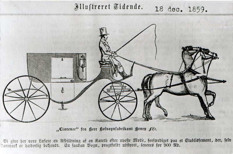 Inskrift: Illustreret Tidene. 18 dec. 1859. / " Clarence" fra Herr Hofvagnfabrikant Henr Sife. / Vi give her vore Laesere en Ufbildning af en Kareth efter nieste Mode, forfaerbiget paa et Etablisssement, her, selv.... / Danmark er haederkig betjendt. / En saadan Vagn, pragtfuldt udsthret, leveres for 900 Rd. /