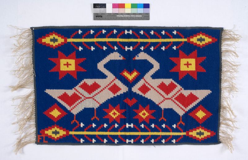 - Vävd bonad i rölakansteknik, ylle på linnevarp. Blå botten med mönster i rött, gult och beige. Motiv av två stiliserade fåglar (gäss?), stjärnor och geometriska figurer. Knuten linnefrans på kortsidorna. Påstruken vliselin på hela baksidan.