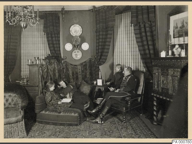 Visitkortsfotograf. Porträtt av Otto, Augusta, Ingeborg och Stig Thott i rumsinteriör.