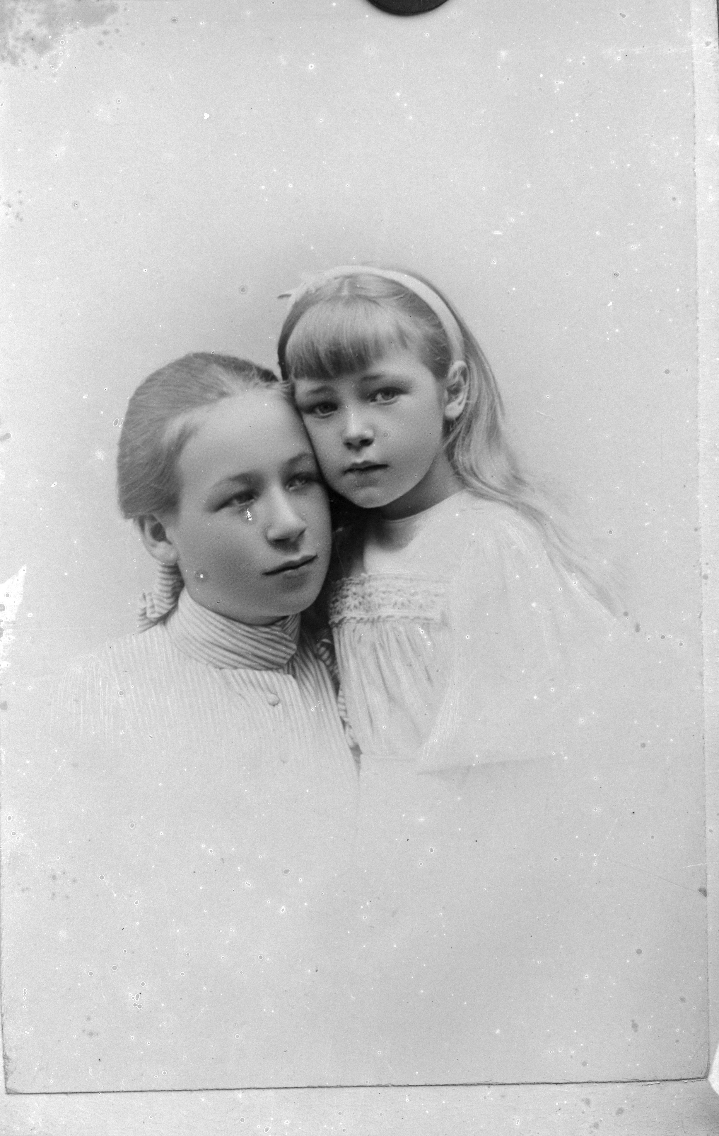 Porträtt i halvfigur av Emma Hansson med okänd kvinna. En av kvinnorna med hårband.