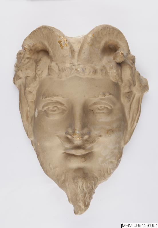 Gipsskulptur, huvud föreställande guden Pan, med spetsiga öron, halvöppen mun och två bockhorn mitt på pannan.