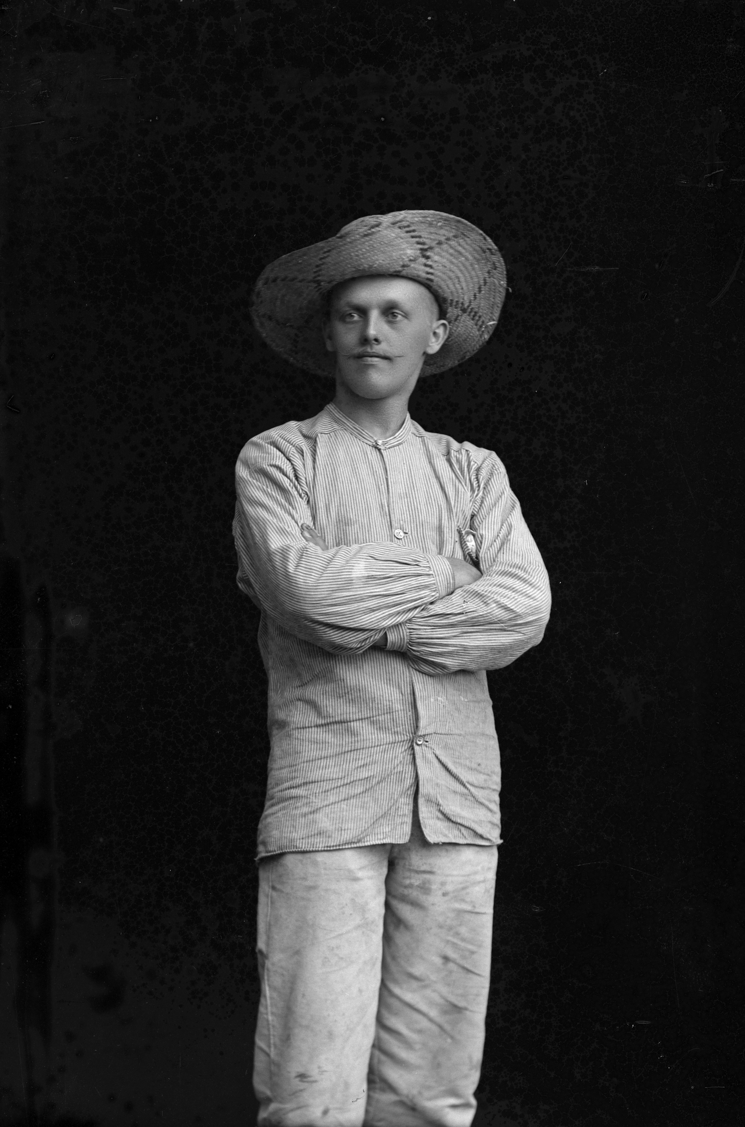 Porträtt i helfigur av arkitekt August Stoltz, iklädd bredbrättad basthatt.