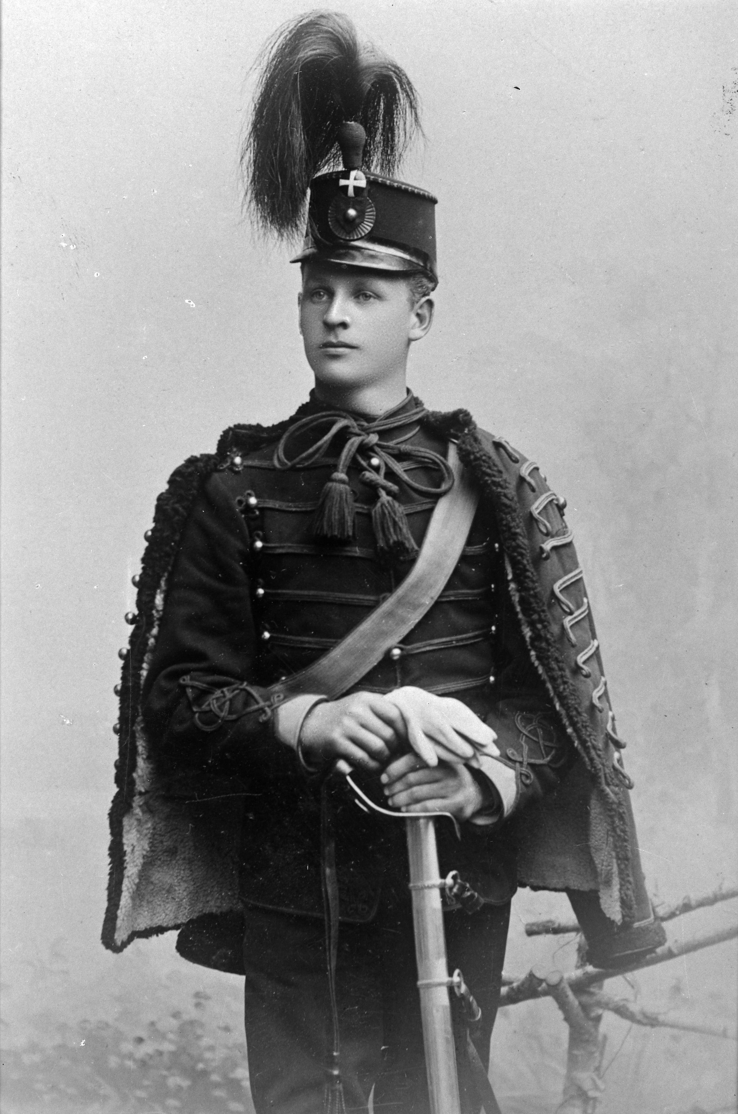 Porträtt i helfigur av oidentifierad man, iklädd militäruniform -mössa, hållande sabel.