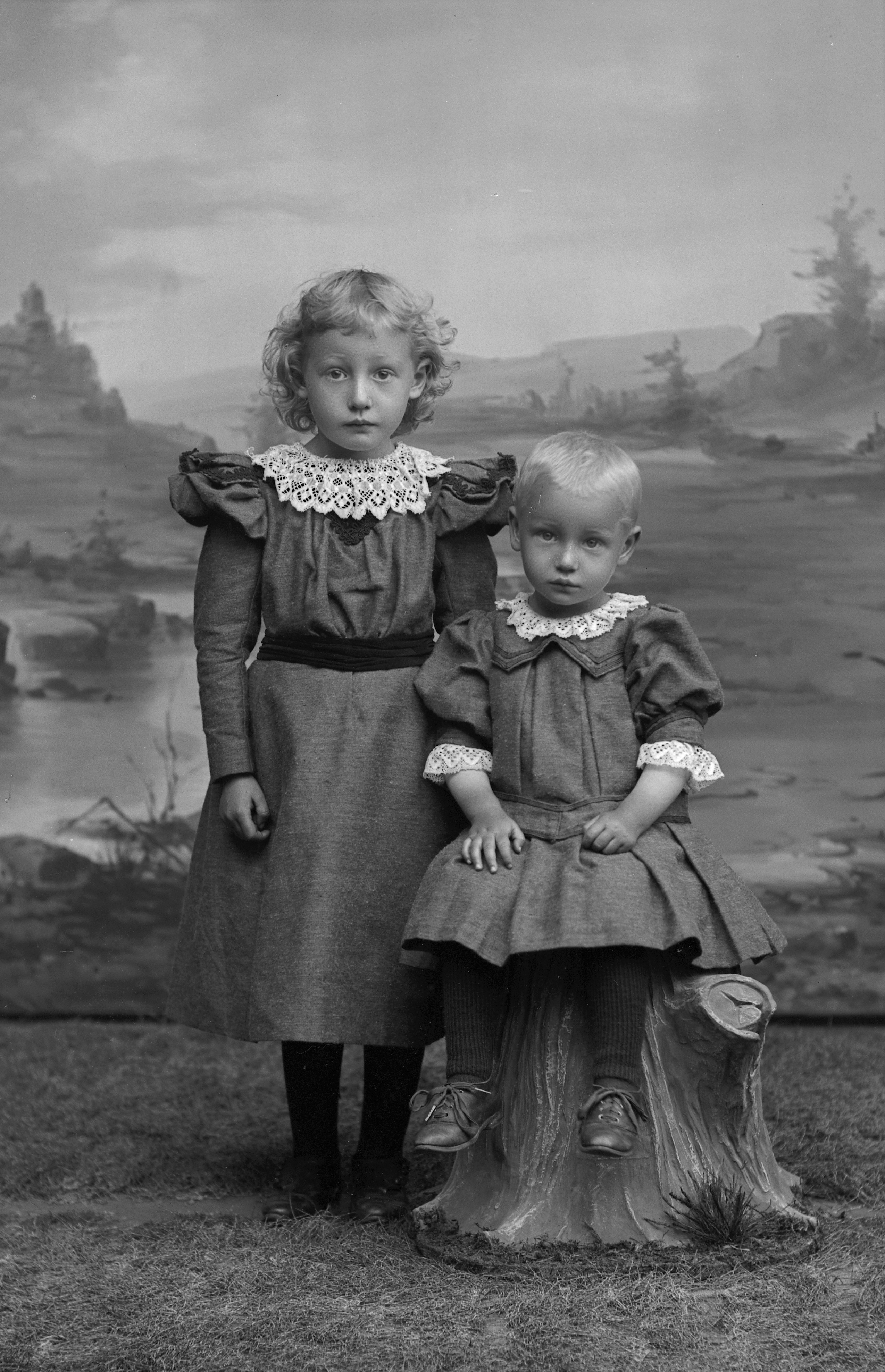 Porträtt i helfigur av S. Lönnroths son och dotter, fotograferade framför ateljéfond med slätt- och skogsmotiv. Sonen sittande på stubbe.