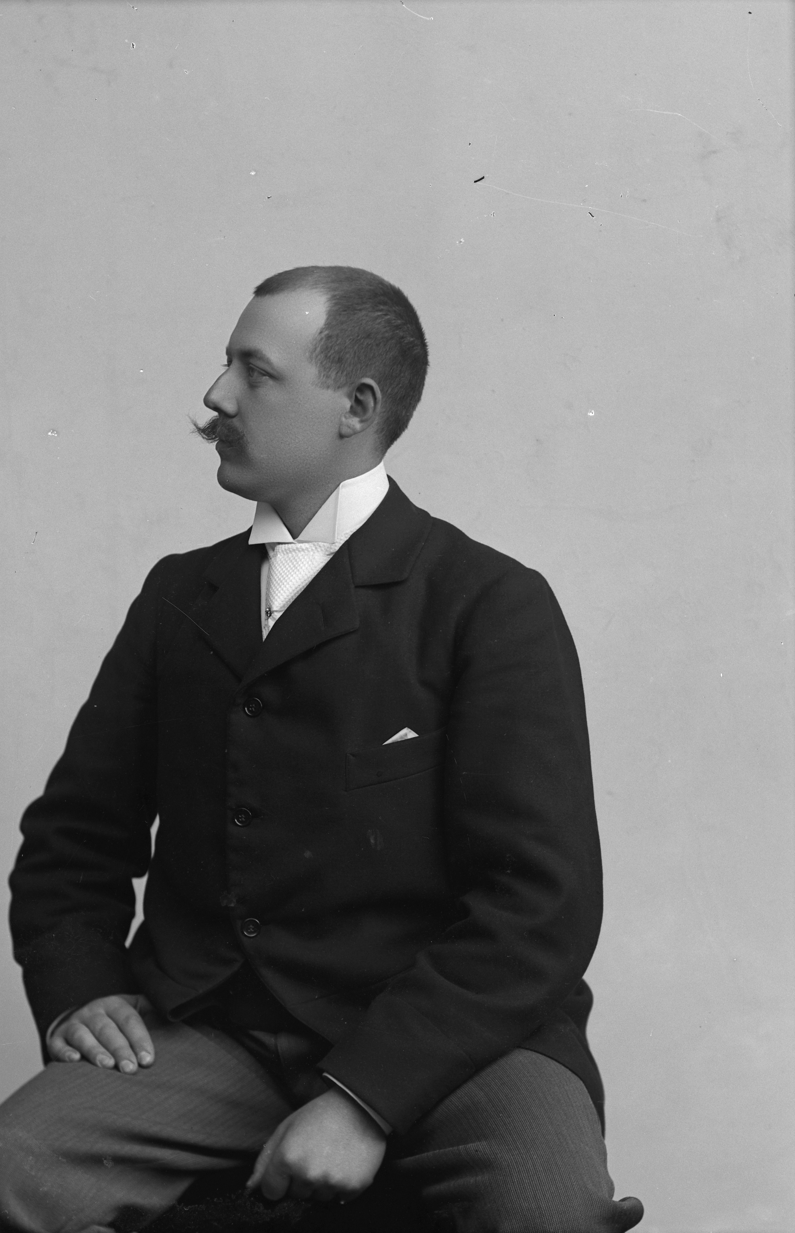 Porträtt i halvfigur av herr Vallentinsson vid C. & M. Fougstedt, ansikte i profil.