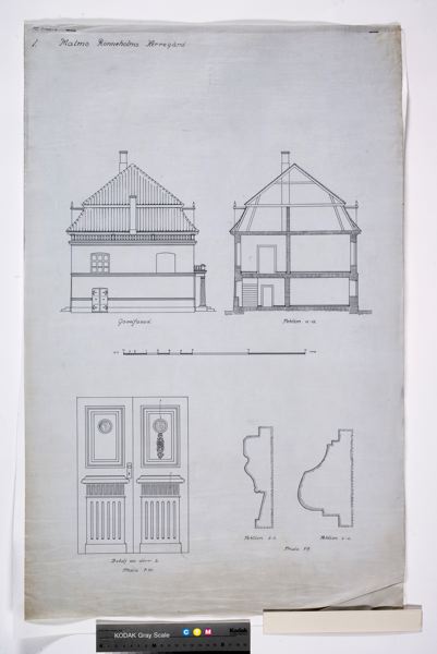 MM 008160:001; Gavelfasad och gavelsektion, Detalj av dörr b och två sektion av dörren.