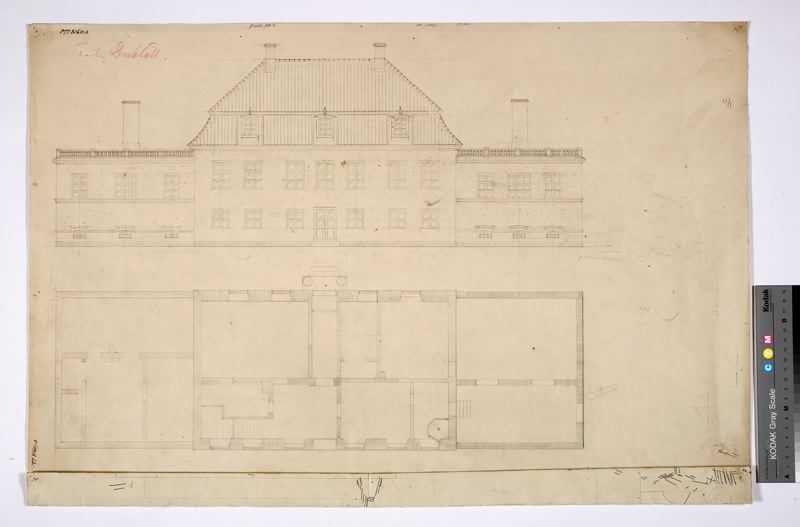 MM 008160:002; Framfasad och plan av första våningen. Finns även ett koncept på kartong