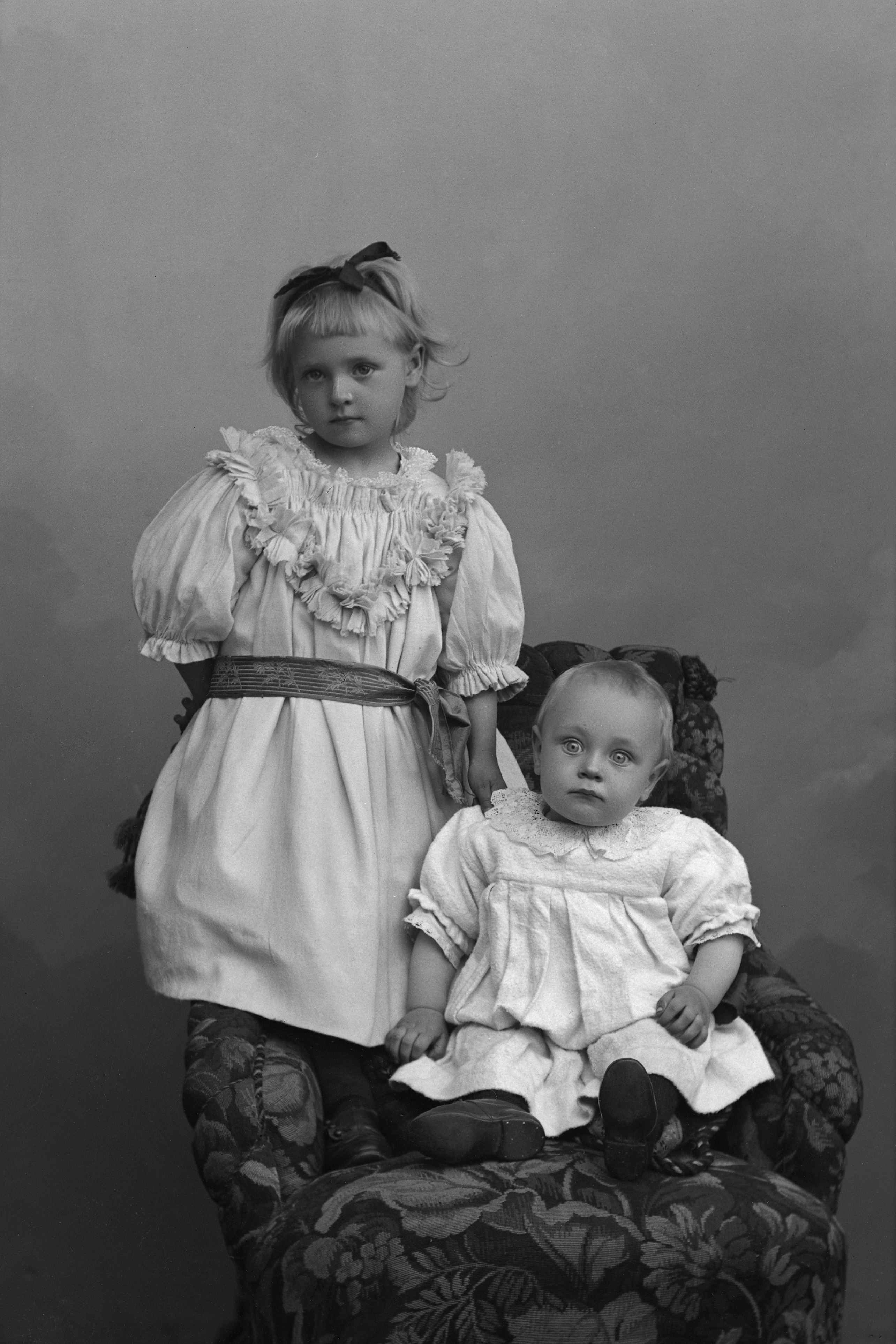 Porträtt i helfigur av fru Brandts barn, det yngsta sittande i stol, dottern med hårband, stående.