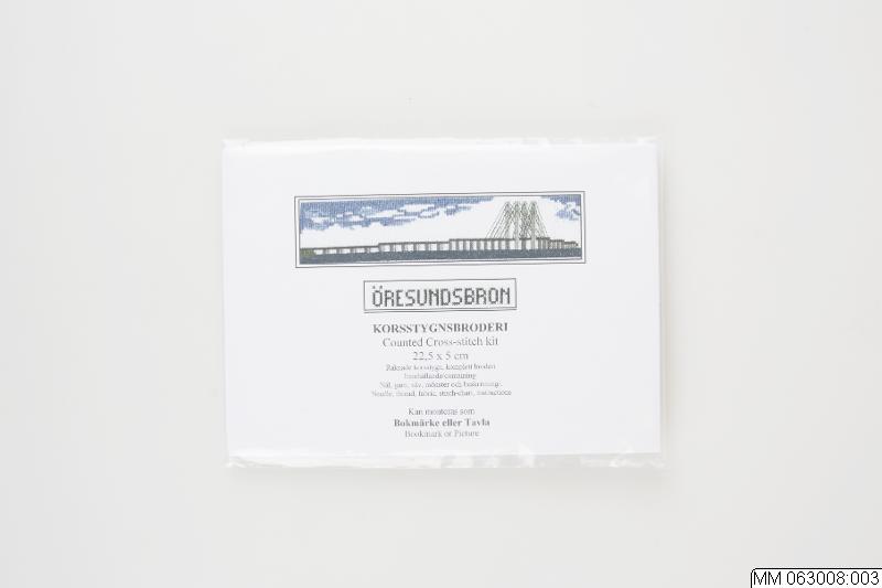 - Ett korsstyngnsbroderi, komplett broderi med nål, garn, väv, mönster och beskrivning. Motivet föreställer Öresundsbron. Med påskriften "Kan monteras som bokmärke eller tavla". Broderiet har sålts i samband med Öresundsutställningen.