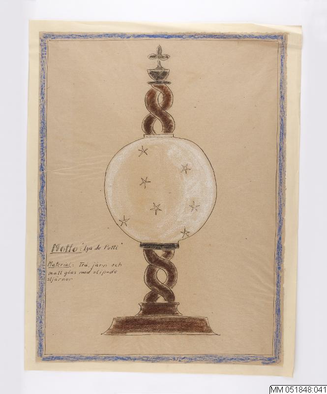 Text på framsida: Material: Trä, järn och / matt glas med slipade / stjärnor.