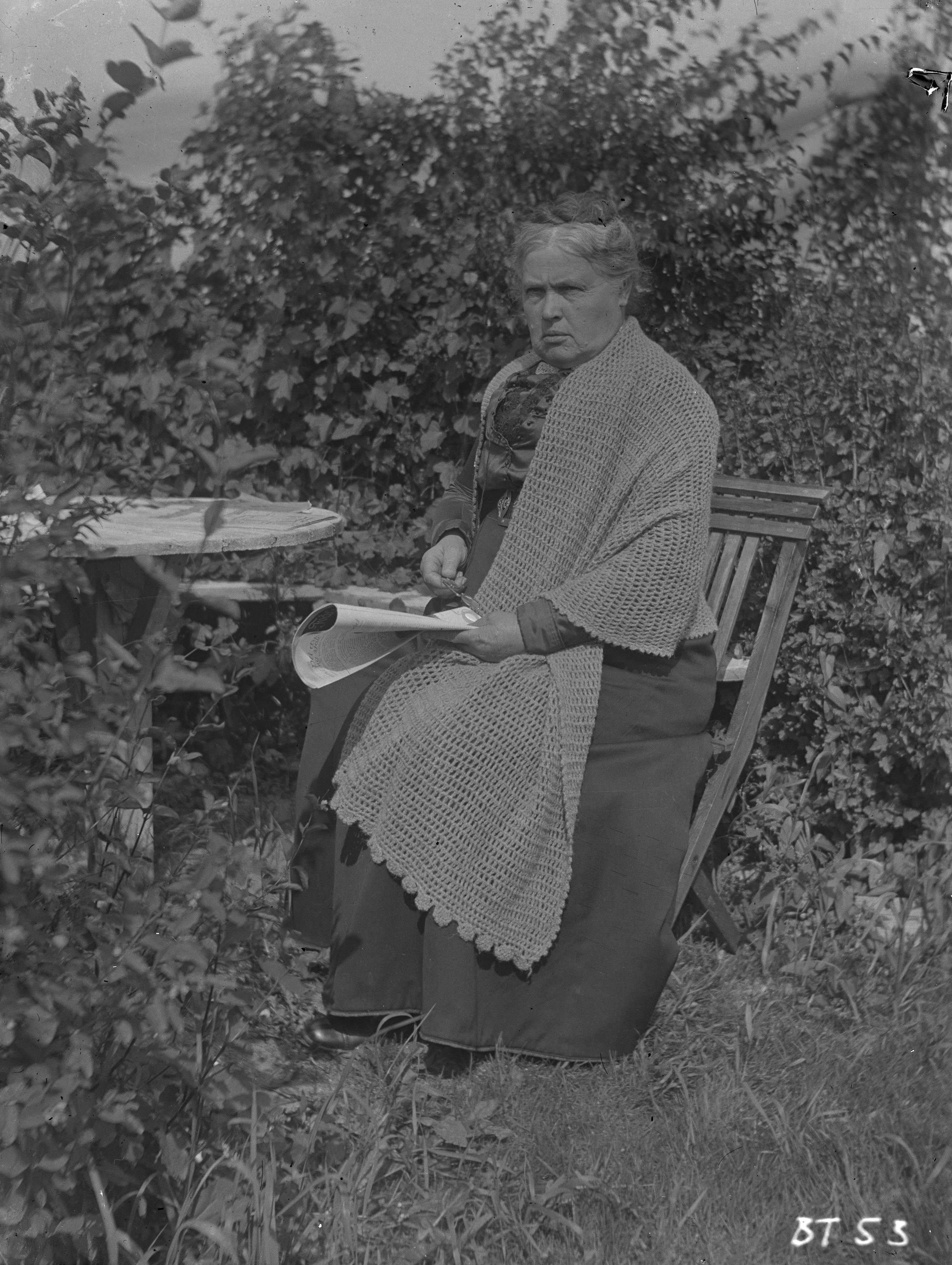 Omkring 1910? En gammal kvinna sittandes vid bordet, exteriör.