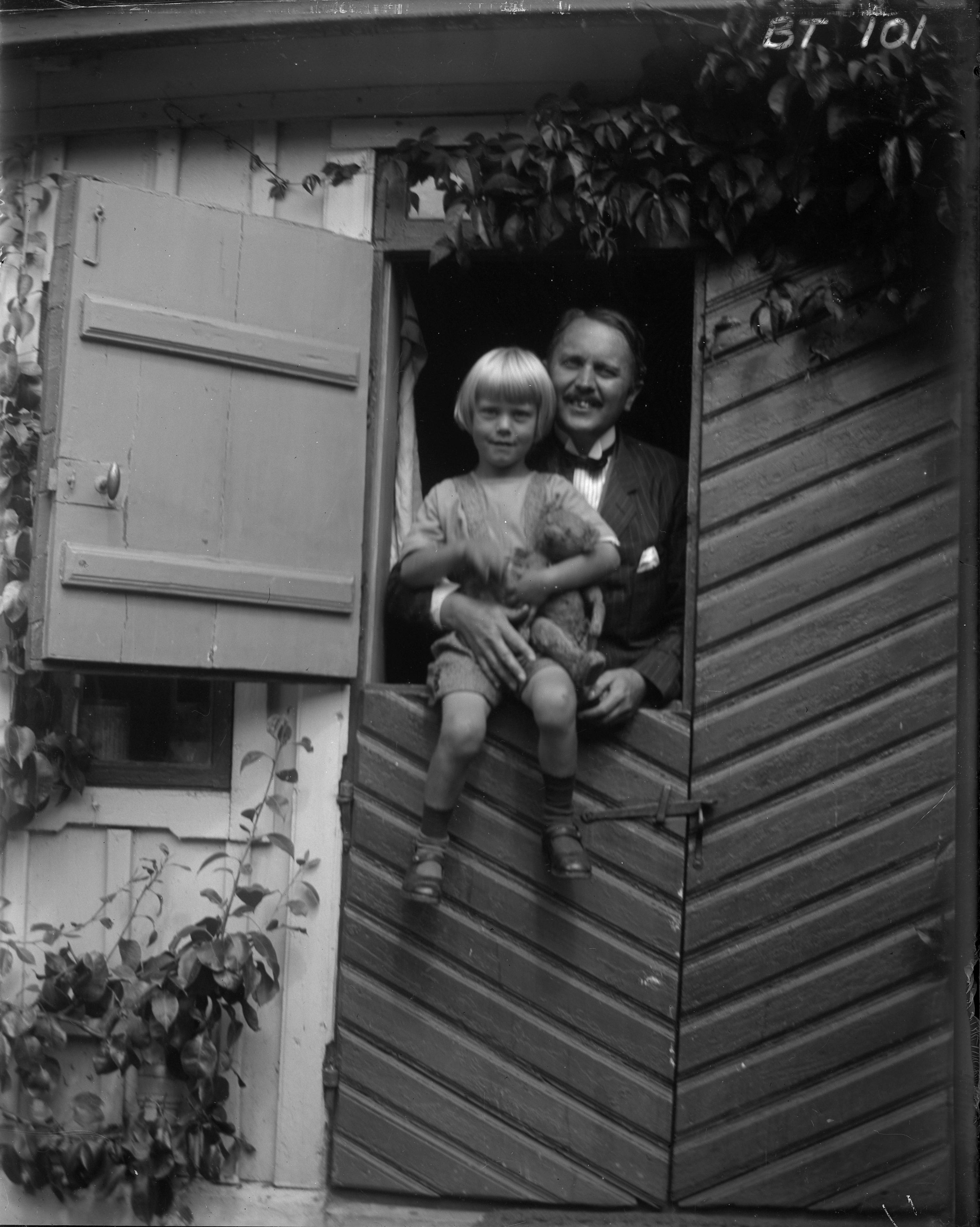 Omkring 1910? En man med en liten flicka i dörröppningen.