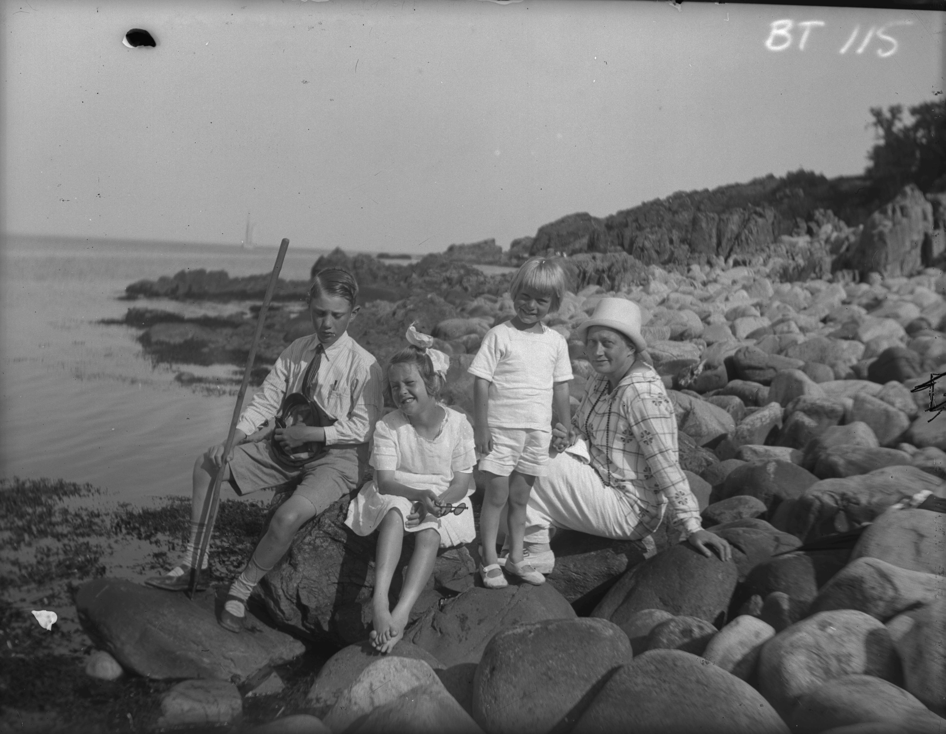 Omkring 1910? En kvinna med tre barn på en stenig havsstrand.
