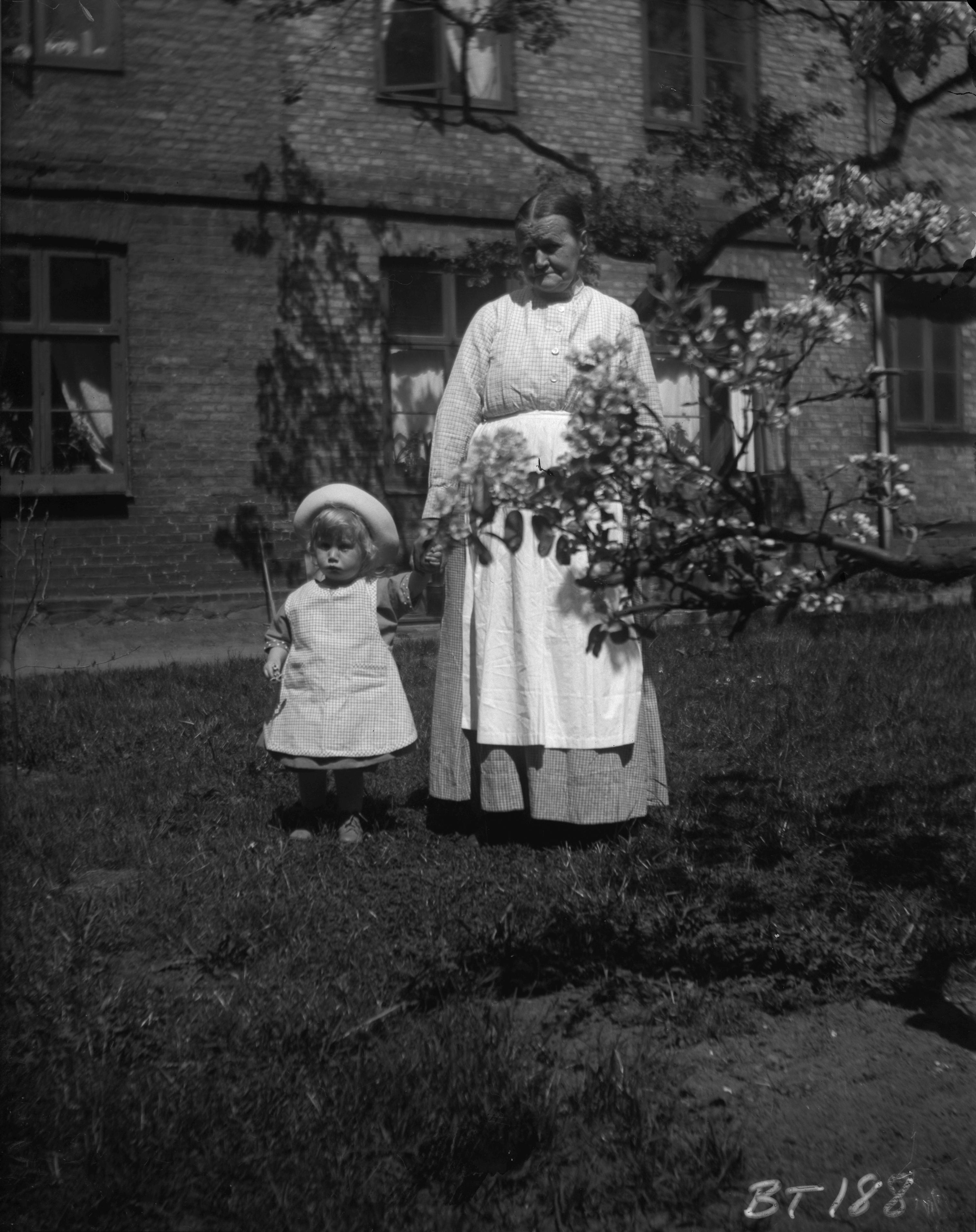 Omkring 1910? En gammal kvinna och en liten flicka i trädgården.