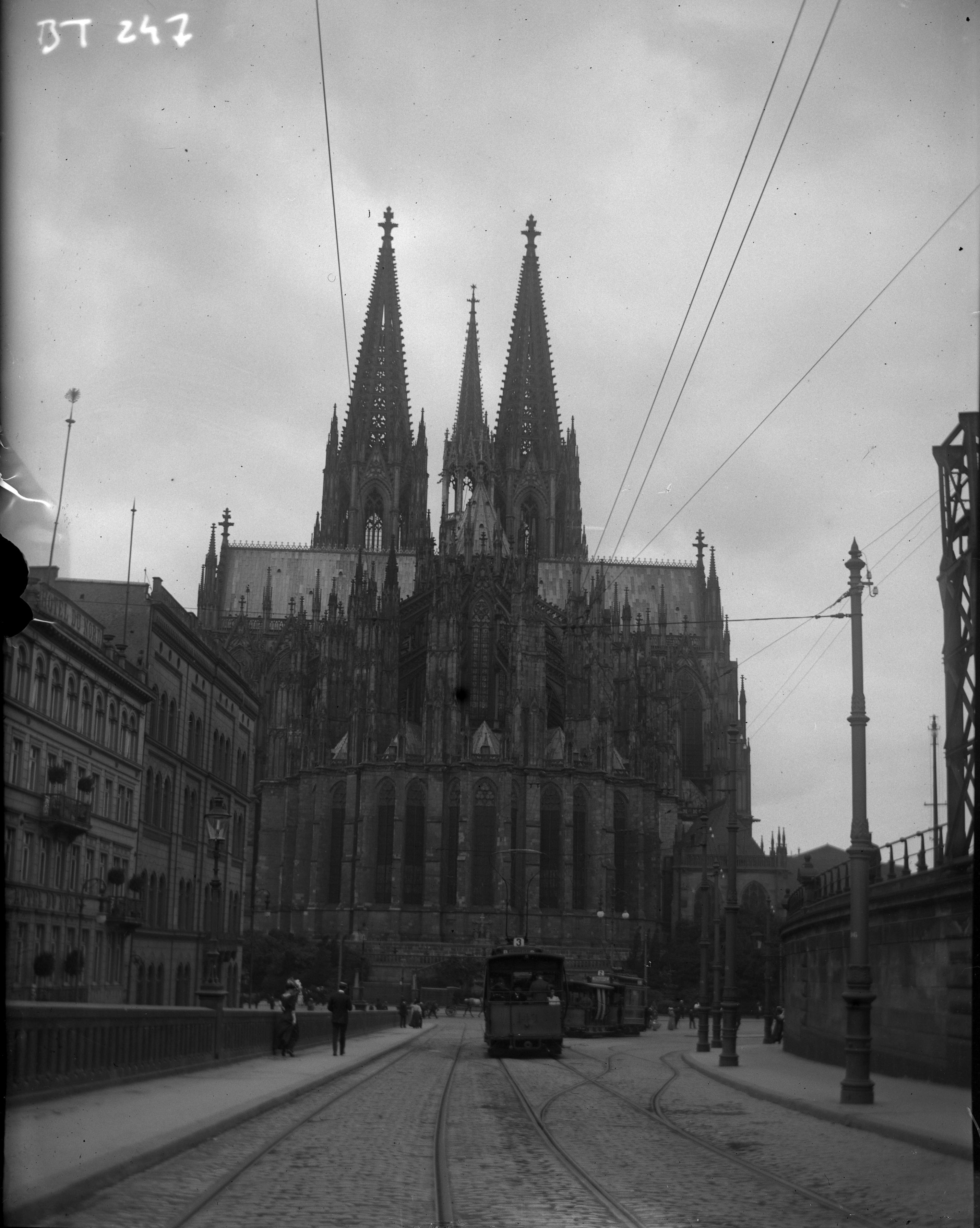 1907. Gatubild - en kyrka och en spårvagn.