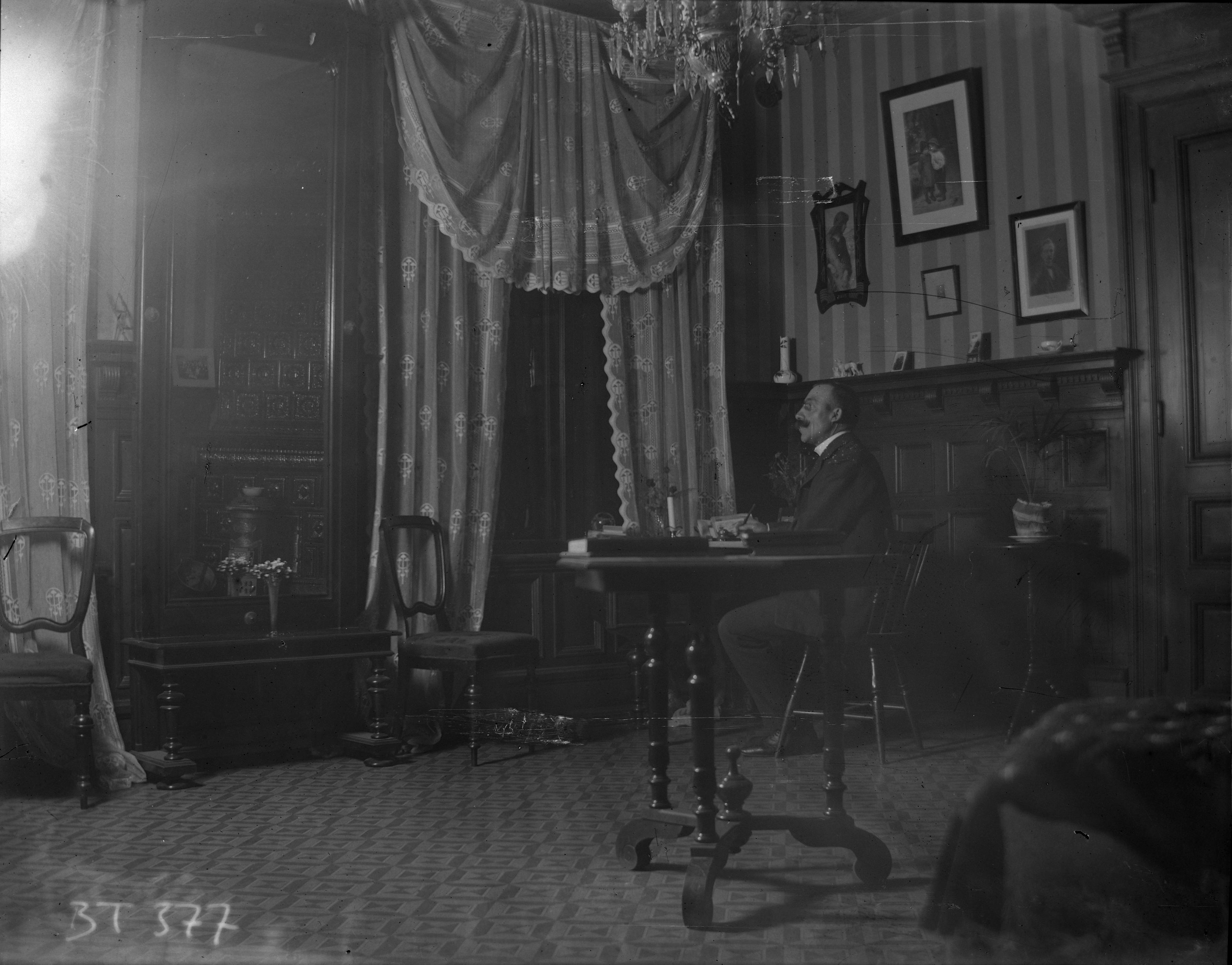 1910. Rumsinteriör, en man vid skrivbordet.