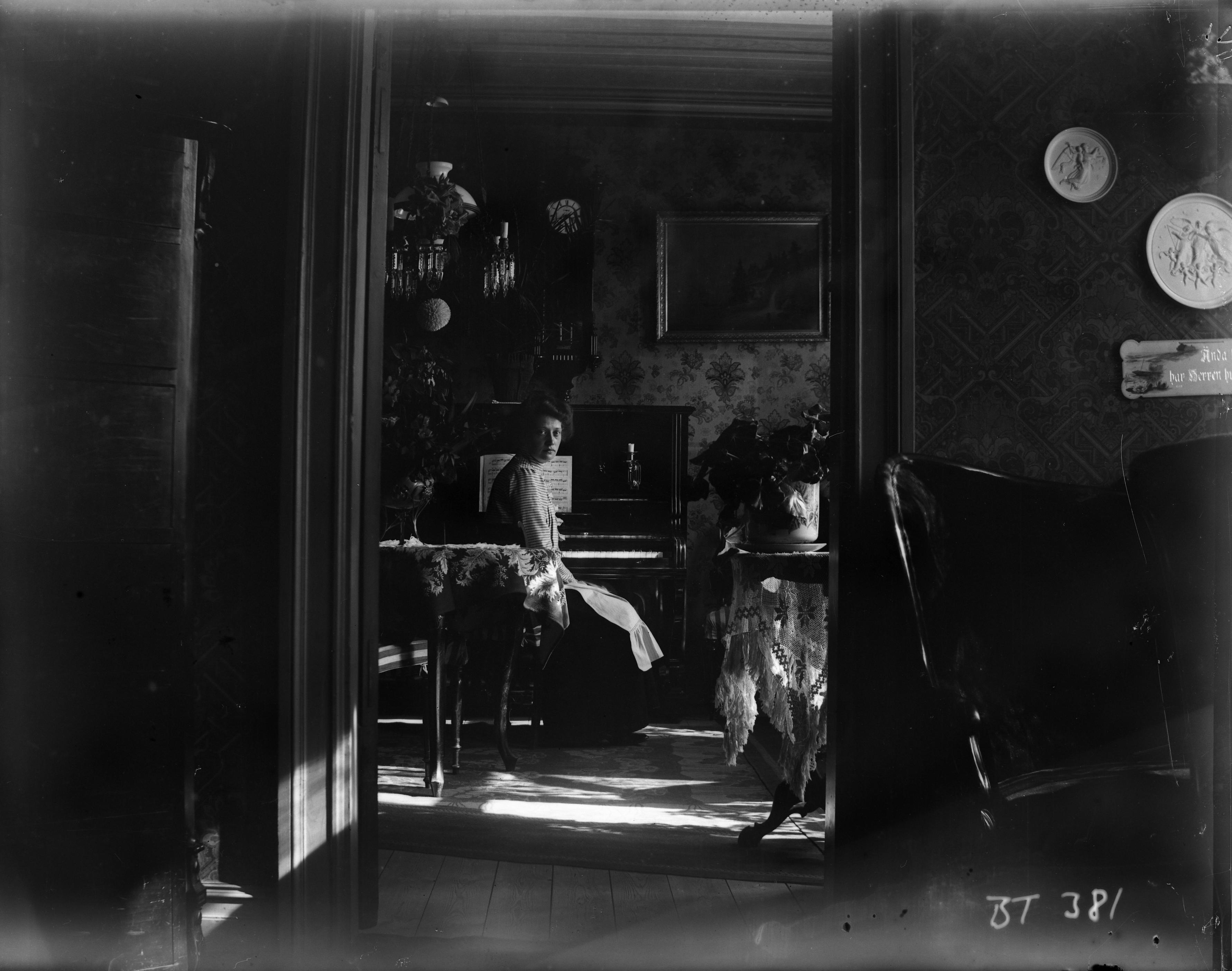 1910. Rumsinteriör - en kvinna vid pianot.