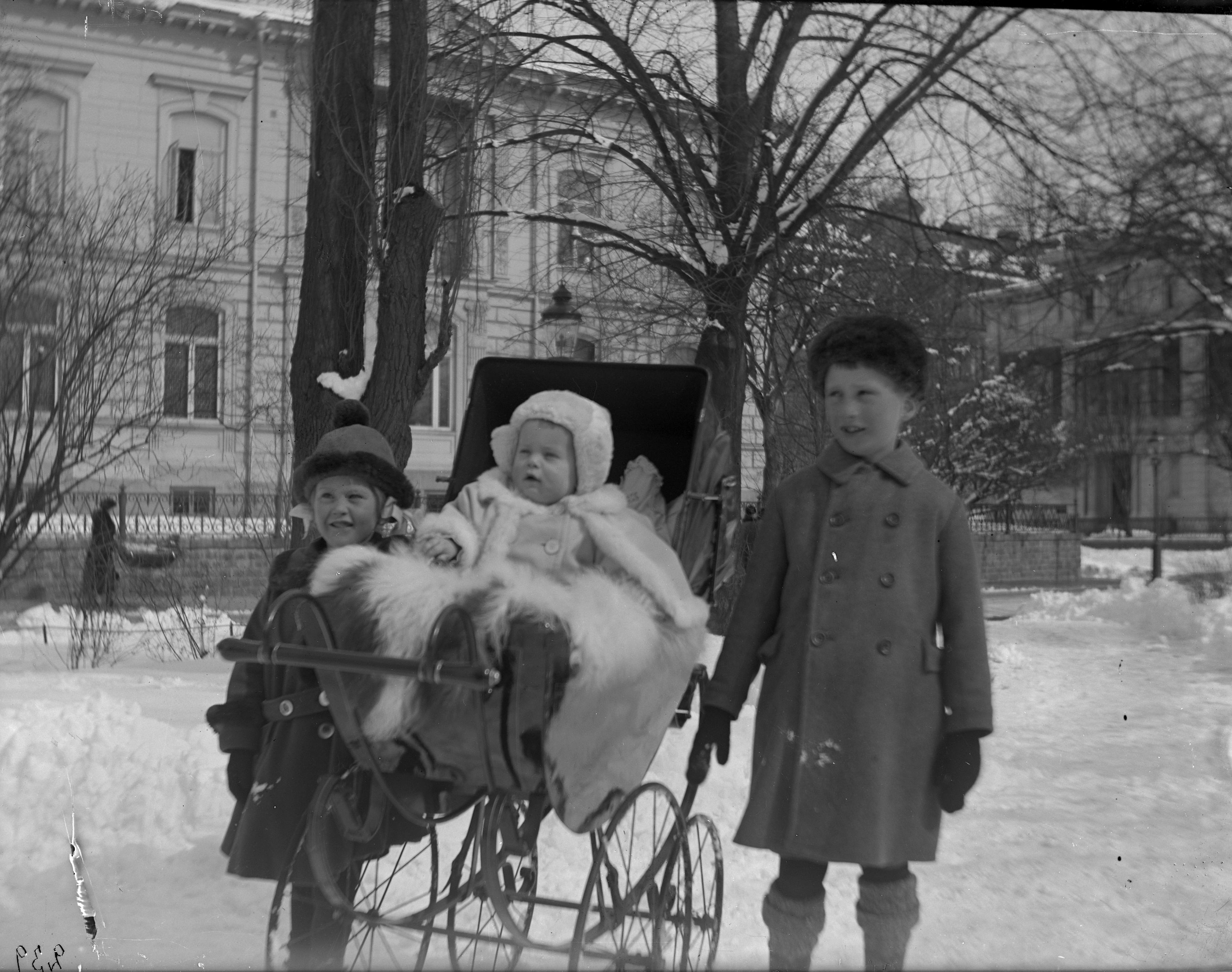 1910. Tre barn, exteriör - vinterbild.