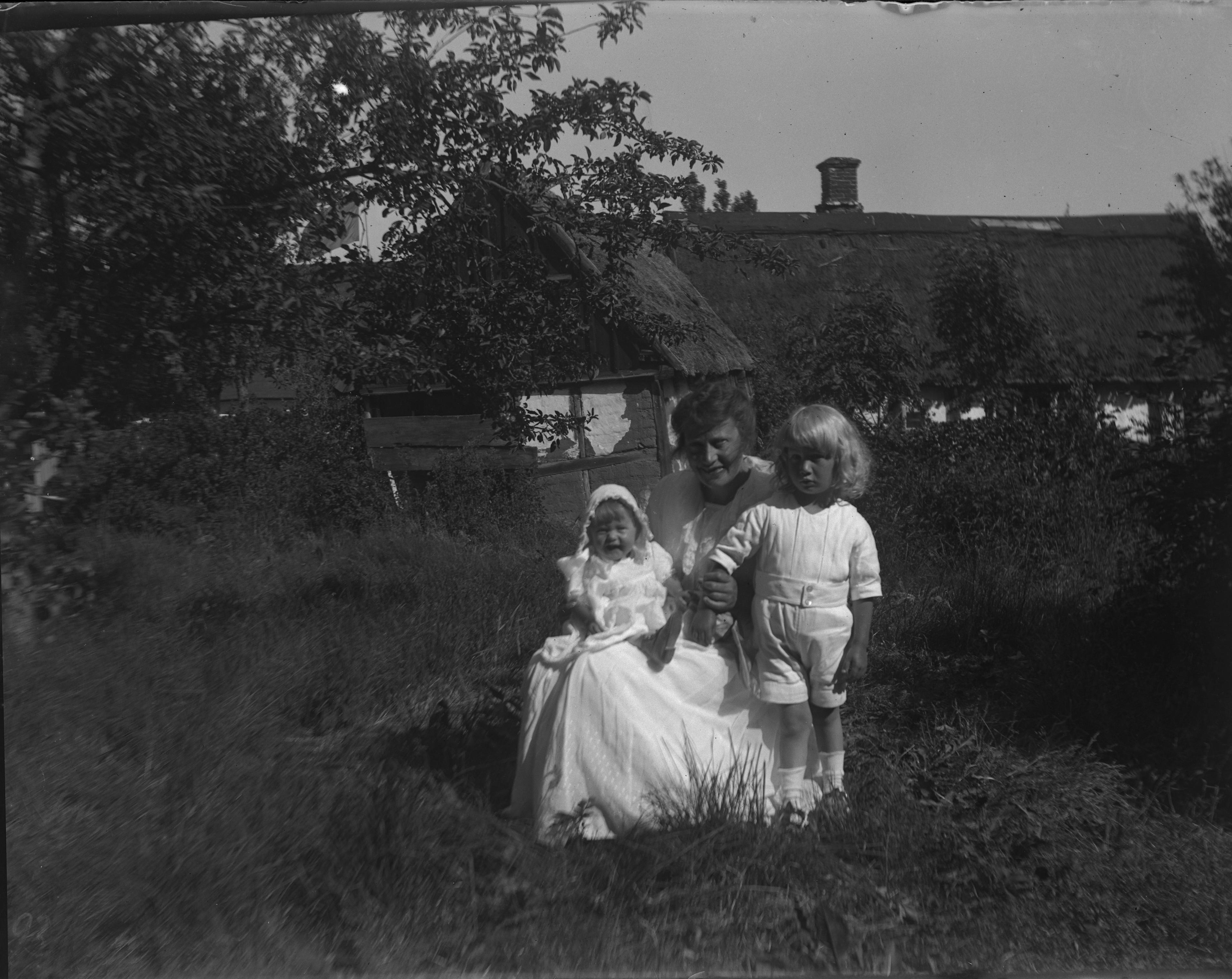 1910. En kvinna med två barn i trädgården.