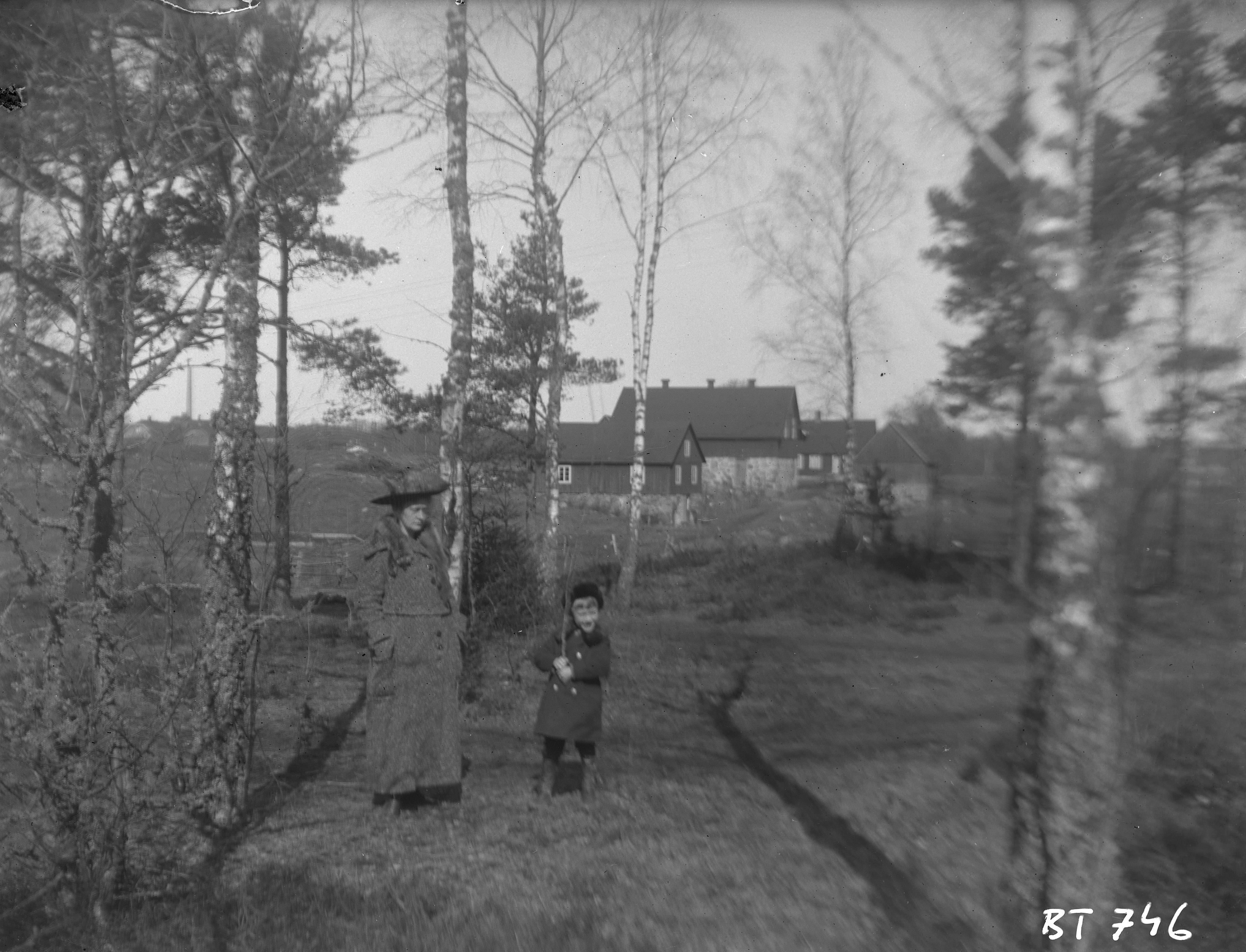 byggnader, kvinna, kvinnor, villa, villor, barn, skogskanter, hus, byggnad, skogskant, träd