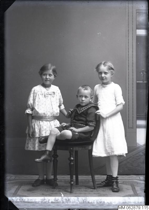 - Grupporträtt av tre barn, två flickor ståendes och en pojke sittandes. Med negativ fanns anteckningen "Magda, 2 st". Låg i låda med skrift "Fröken Skog Fröken Linde Fröken Berni och Sam" (svårläst). Okänt datum.