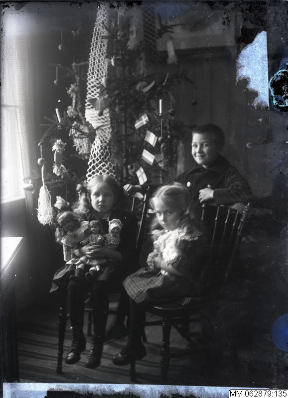- Grupporträtt på tre barn, två flickor sittandes och en pojke ståendes framför en julgran som står vid ett fönster. Låg i låda med anteckningarna "samtliga fotografier höll sammanträde här den 21-10-1935, Floo F. Weyer 3-, Skånebergs Palmgård" (svårläst). Datum okänt.