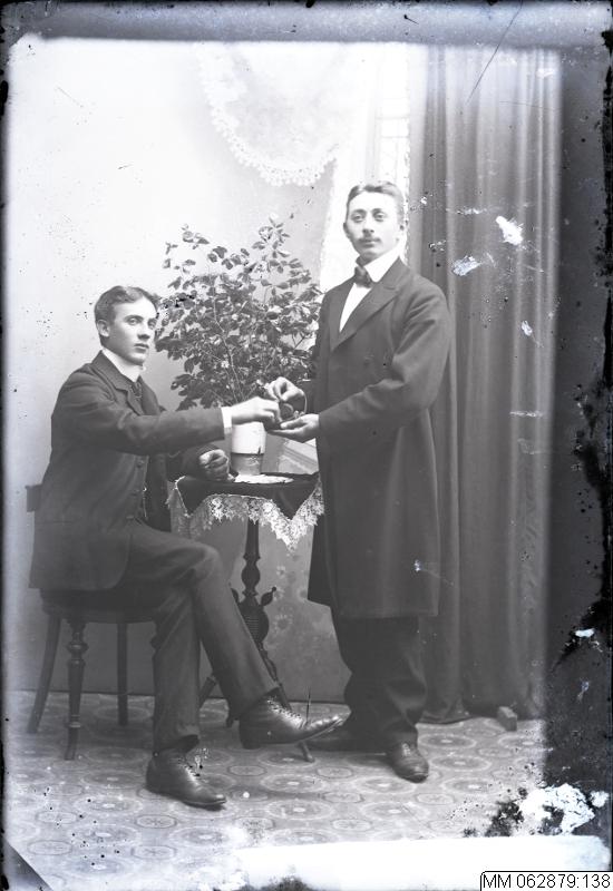 MM 062879:138 :: män, stol, bord, växt, blomkruka, draperi
