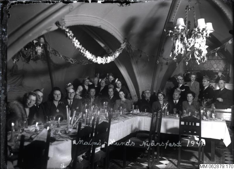 - Grupporträtt på sällskap vid långbord på nyårsfest 1946. På negativ finns skriften "Malmö-Lunds Nyårsfest 1946". Låg i låda med skriften "Weyer 1947, ex hårt, extra hårt" (svårläst). Troligen år 1946, januari, dag okänt.