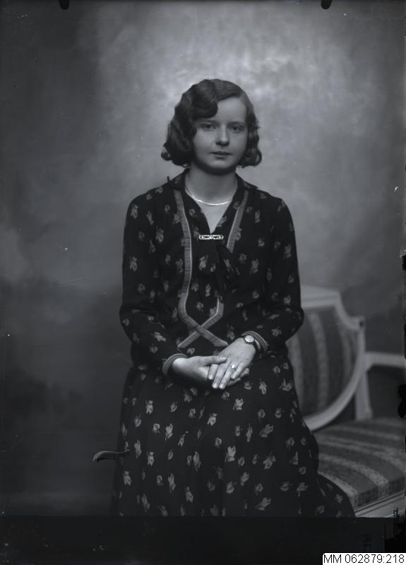 Porträtt på en kvinna, i bakgrunden syns en stol. Låg i låda med skriften "Anna Hamlund, Mina och vi Linnea thal"(svårläst). Datum okänt.