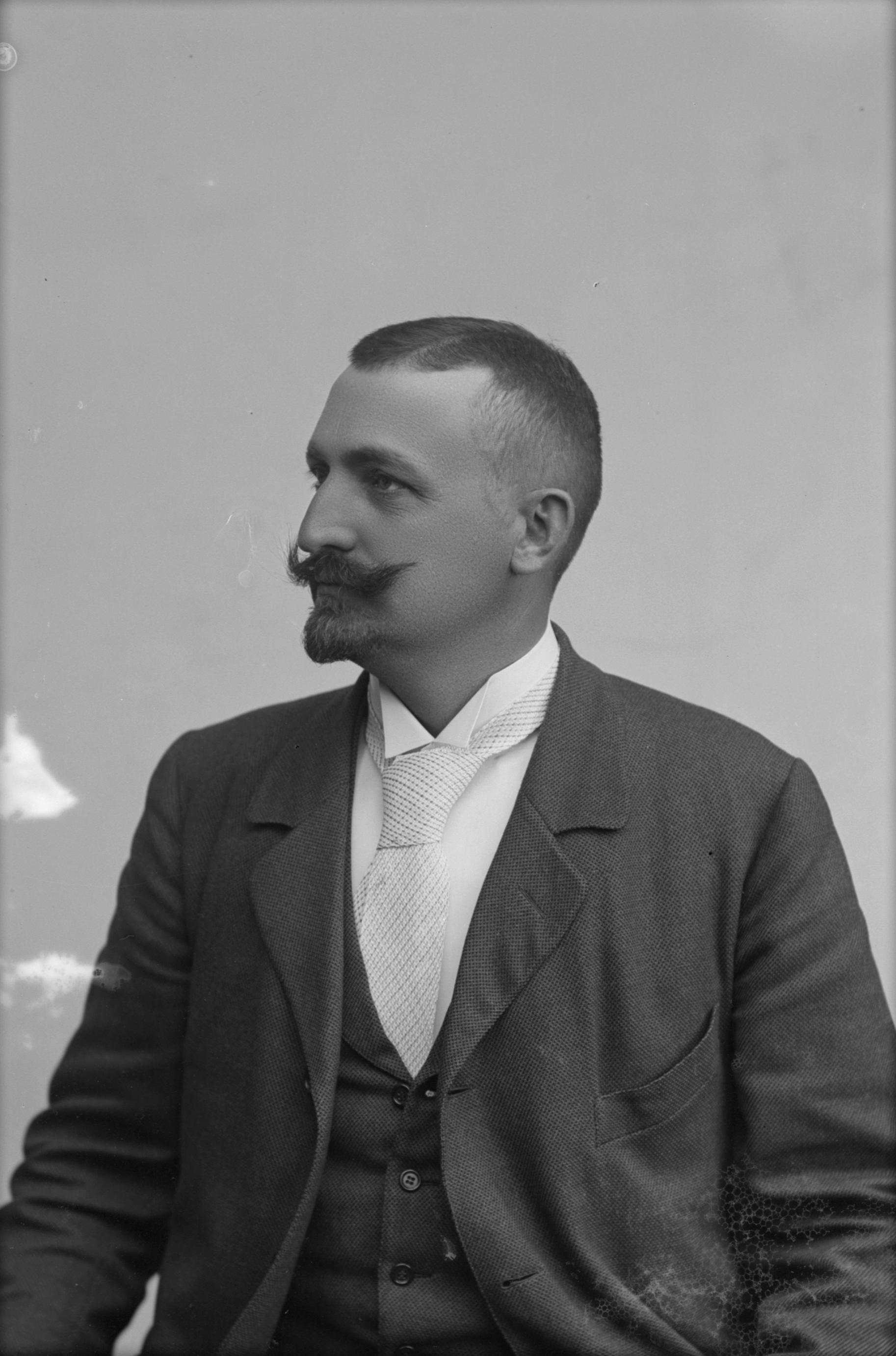 Porträtt i halvfigur av kappfabrikör Florentin Steneberg, ansikte i profil.