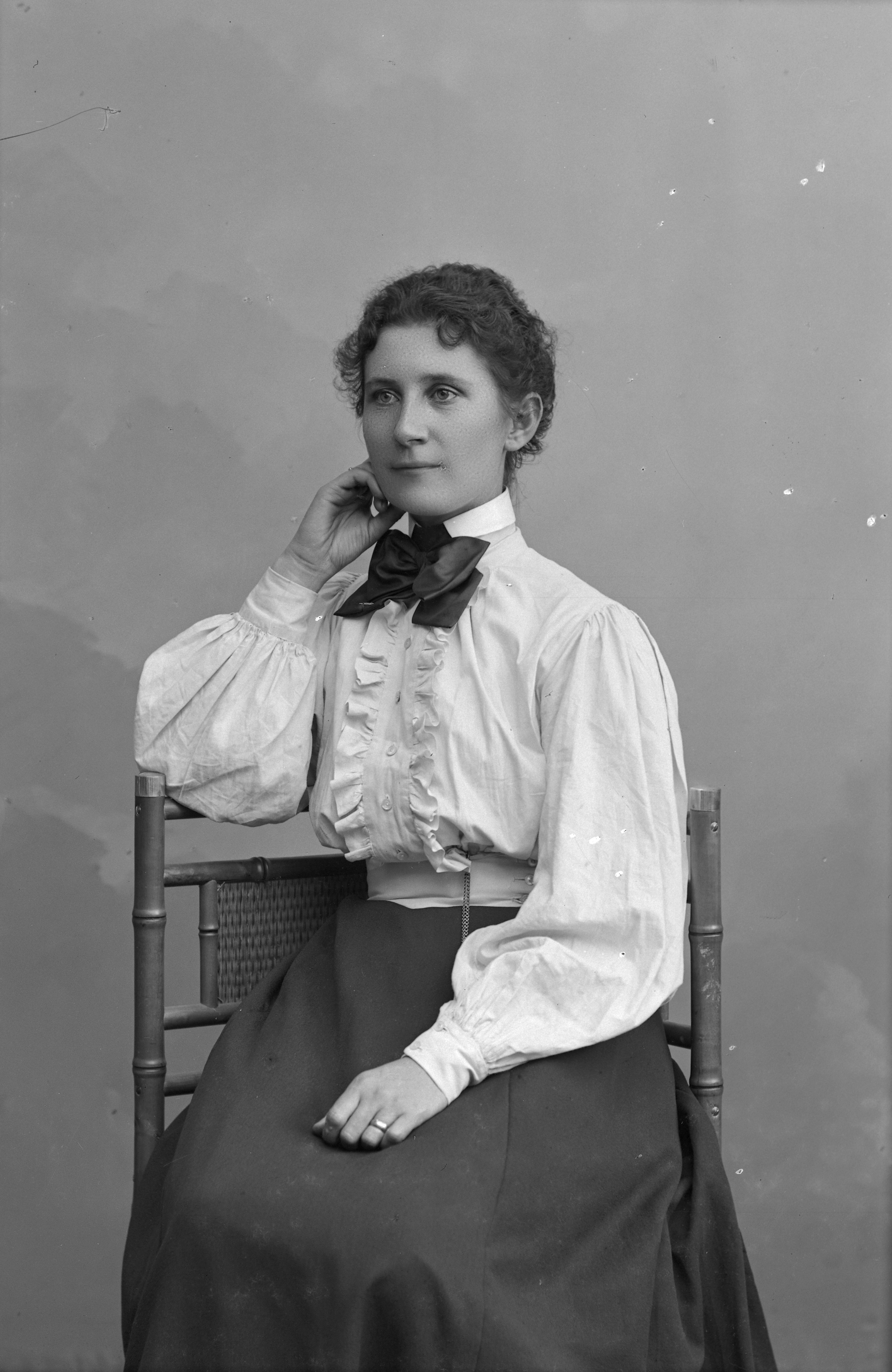 Porträtt i helfigur av sömmerskan Anna Fridolf i Simrishamn, sittande i stol. Hon bär en stor rosett vid bluskragen.